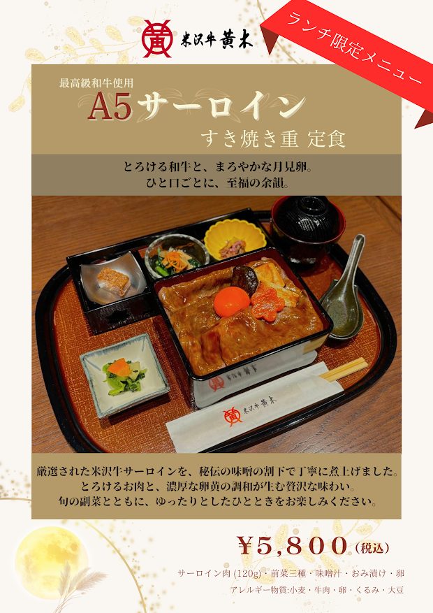 期間限定で米沢牛A5ランクのサーロインを使用した、すき焼き重定食を販売しております。